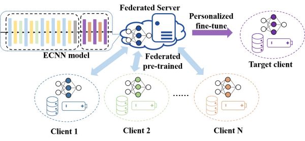 该团队提出了两阶段联邦迁移学习框架。第一阶段采用联邦迁移学习框架,使多个分布式电池通过共享模型参数,协作训练全局模型,既可以学习通用知识又能够?;な菀?;在第二阶段,通过目标电池的少量本地数据对这一全局模型进行微调,建立捕获个体电池特征的个性化模型。联邦迁移学习框架构建在轻量级卷积神经网络上,并通过有效的通道注意机制提升了性能。实验结果表明,该框架在公共快充电池数据集上的预测性能优于传统方法。