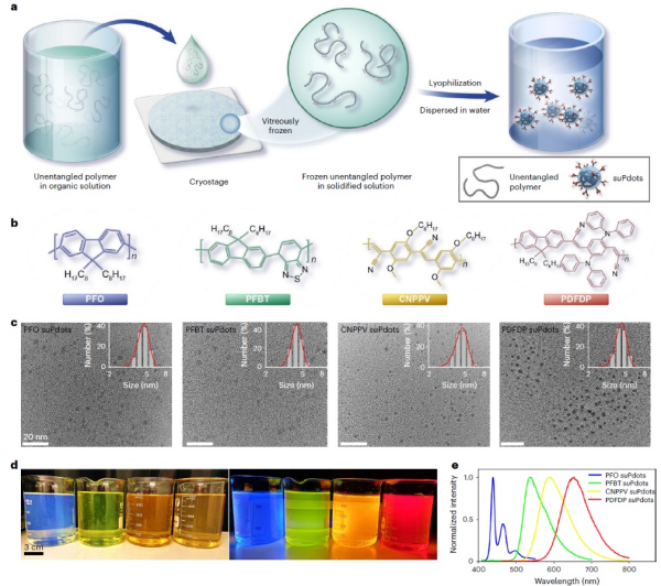 近日,中国科学院理化技术研究所研究员王健君团队联合杭州医学研究所研究员方晓红团队,在揭示冰晶成核与生长机制的基础上,发明冷冻组装策略,将单条有机荧光聚合物链,制备成尺寸<5nm的单链超小荧光聚合物纳米点(suPdots)。这些suPdots组成明确、表面易修饰、荧光发射可调、高亮度和优异光稳定性,为先进荧光显微成像提供了探针工具。